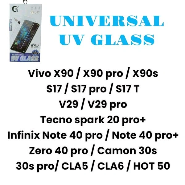 Vivo X90 / X90 pro / X90s / S17 / S17 pro / S17 T / V29 / V29 pro / Tecno spark 20 pro+ / Infinix Note 40 pro / Note 40 pro+ / Zero 40 pro / Camon 30s/ 30s pro/ CLA5 / CLA6 / HOT 50 Universal Uv Glass